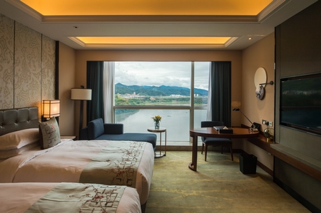 南平雅閣國際大酒店位于延平區(qū)朱熹路56號,酒店距離市中心約7公里,高鐵北站、夏道大橋、咫尺可達(dá)。占地面積約80畝,總建筑面積6.29萬平方米,北塔樓14層,南塔樓13層。酒店集客房、餐飲、娛樂、商務(wù)、大型會(huì)議中心、武夷山水品牌店為一體。擁有各式客房277間,其中江景大床房108間、江景雙床房73間、豪華江景大床房30間、豪華江景套房19間、行政江景大床房27間、行政江景雙床房8間、行政江景套房3間、家庭江景房9間;涵蓋10000平方米全景豪華餐廳包房14個(gè),可容納190人用餐的西餐廳1個(gè),容納52位+2包廂的日餐廳1個(gè);容納68位休閑大堂吧1個(gè);800平方米無柱式國際會(huì)議廳1個(gè)、680平方米小宴會(huì)廳1個(gè),會(huì)議室5個(gè);休閑茶藝包房8間、健身房1個(gè)和361個(gè)停車位的停車場等配套設(shè)施。