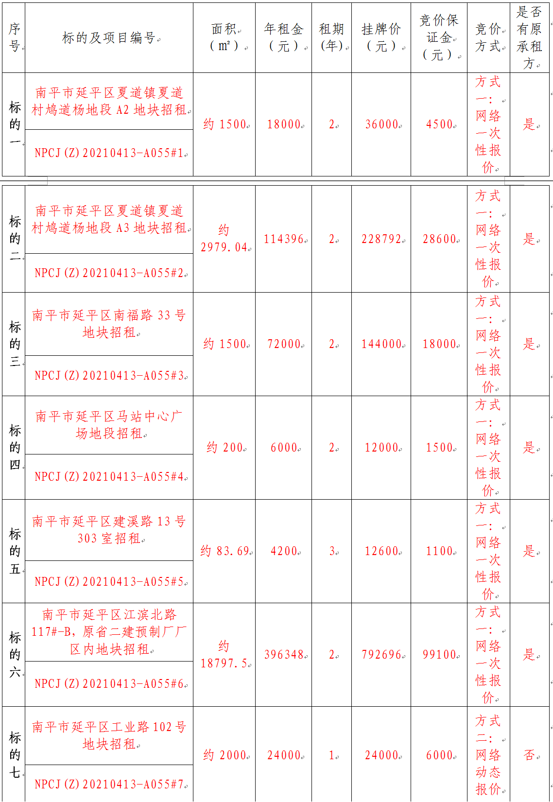 1.合同履約保證金:3個(gè)月租金(保證金不計(jì)息)。 2.特別提示: 2.1租賃標(biāo)的四僅為地塊使用權(quán)租賃,不含地塊所附著建筑物。承租方需自行與原承租戶協(xié)商相關(guān)事宜,如協(xié)商不成,原承租戶有權(quán)拆除其出資建設(shè)的所有附著物,并將地塊恢復(fù)原貌(相關(guān)拆除費(fèi)用由原承租戶自行承擔(dān)); 2.2租賃標(biāo)的五僅為房屋使用權(quán)租賃,不含房屋所附著的裝潢裝修、家具家電等,上述附著物歸原承租戶所有,承租方需自行與原承租戶協(xié)商相關(guān)事宜,如協(xié)商不成,原承租戶有權(quán)拆除其出資建設(shè)的所有附著物,并將房產(chǎn)恢復(fù)原貌(相關(guān)拆除費(fèi)用由原承租戶自行承擔(dān)); 2.3租賃標(biāo)的六僅為地塊使用權(quán)租賃,不含地塊所附著建筑物,承租方需自行與原承租戶協(xié)商地塊內(nèi)三通一平道路支護(hù)、水電增容及建筑物等相關(guān)事宜; 2.4租賃標(biāo)的七承租方需自行辦理水、電、網(wǎng)絡(luò)等,費(fèi)用由承租方自行承擔(dān)。 3.承租方不得在地塊內(nèi)擅自搭建,不得改變承租用途,不得擅自以任何形式轉(zhuǎn)租。 4.承租方對(duì)租賃物業(yè)進(jìn)行改造裝修或搭建臨時(shí)建筑物的,須先征得出租方書(shū)面同意后方可施工,費(fèi)用及相關(guān)用地行業(yè)報(bào)批的手續(xù)由承租方自理。租賃期滿或解除合同的,依附于房屋的裝修無(wú)償歸出租方所有,承租方不得拆除及提出任何補(bǔ)償。 5.租賃期間,若因城市規(guī)劃、政府行為或社會(huì)公共利益需要,租賃合同終止履行;承租方自收到出租方書(shū)面通知后,應(yīng)于60天內(nèi)將租賃標(biāo)的物無(wú)條件交還出租方;承租方在該地塊投入的一切經(jīng)營(yíng)成本不予退還。 6.租賃標(biāo)的一至標(biāo)的四及標(biāo)的六至標(biāo)的七承租方除正常在地塊下經(jīng)營(yíng)外,還需對(duì)該租賃標(biāo)的地塊隸屬的土地證范圍內(nèi)(其中租賃標(biāo)的一至標(biāo)的二的土地權(quán)證號(hào):南國(guó)用(2016)第000513號(hào);租賃標(biāo)的三土地權(quán)證號(hào):閩(2019)南平市不動(dòng)產(chǎn)權(quán)第0009870號(hào);租賃標(biāo)的六土地權(quán)證號(hào):南國(guó)用(2012)第000326號(hào);租賃標(biāo)的七土地權(quán)證號(hào):南國(guó)用(2015)第004452號(hào))的地塊進(jìn)行看護(hù),不得出現(xiàn)違建、蠶食等侵占現(xiàn)象。 7.租賃期滿后,承租方如有意向繼續(xù)承租,則該承租方在同等條件上享有優(yōu)先承租權(quán)。 |