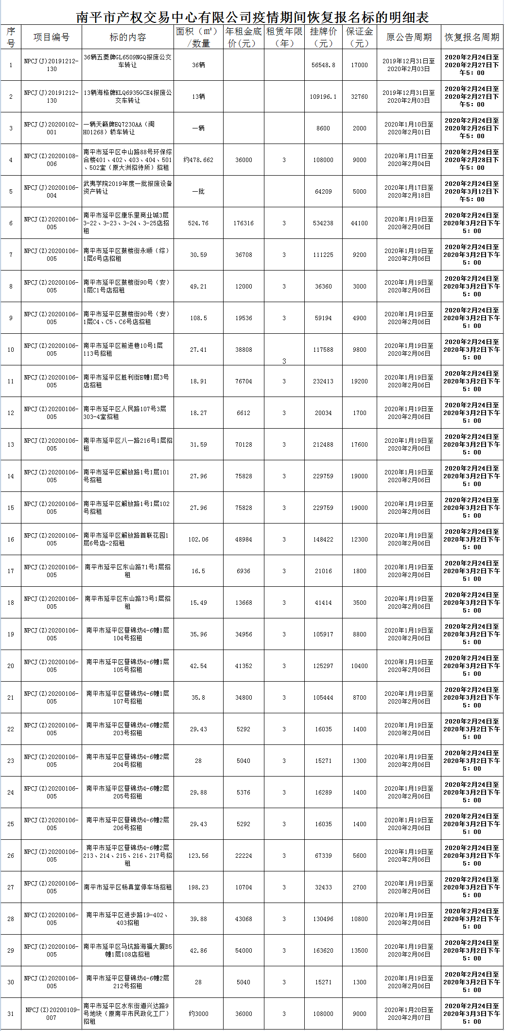 2.疫情防控期間已暫停項目如“36輛五菱牌GL6509NGQ報廢公交車轉(zhuǎn)讓項目”等31個項目恢復(fù)掛牌交易(具體情況詳見附表),各服務(wù)對象按公告交易期限進行報名、交易等流程;后續(xù)項目交易活動請持續(xù)關(guān)注本公司網(wǎng)站(http://m.2917225.cn)和微信公眾號(npscqjyzx);
